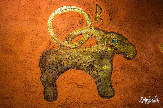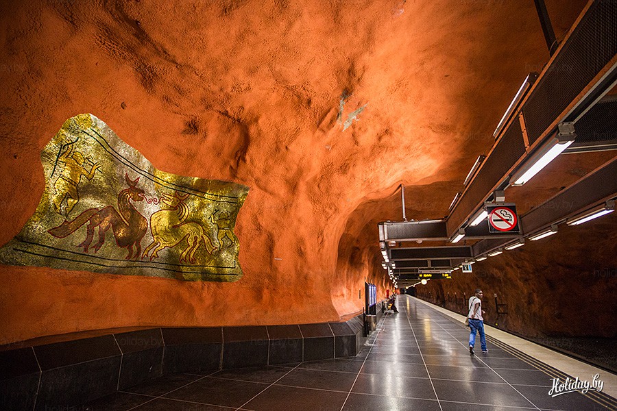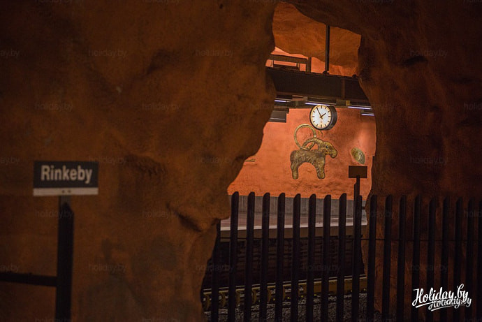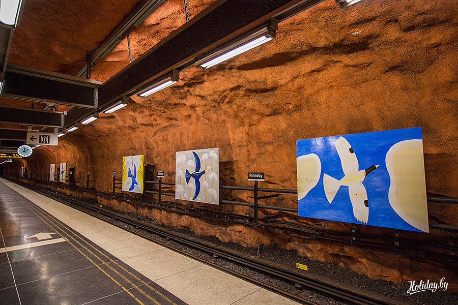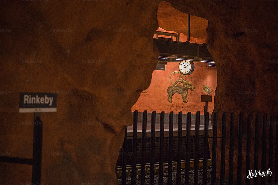 Rinkeby. Художественная концепция станции основана на древних реликвиях, включающих золотые барельефы, мозаичные полотна и рунические письмена на краснокирпичных кладках, сохранившихся в фонде древностей.