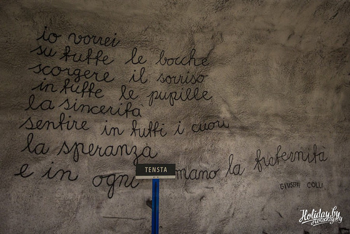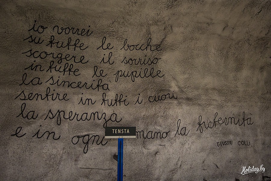 Tensta. Художник Helga Henschen заполнила пространство горной стены, покрашенной в белый цвет, различными цитатами и изображениями. Плакаты на 18 языках мира в честь многочисленных эмигрантов, населяющих район Tensta, демонстрируют братство, на каждом написано о солидарности.