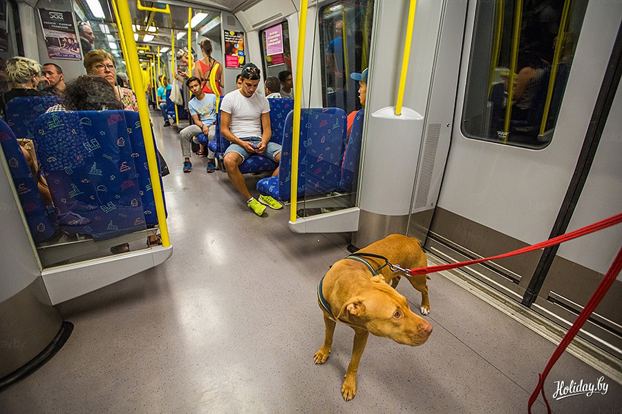 В метро запросто можно ехать с собакой без намордника, не важно, какой породы, и никто не будет паниковать, что животное в таком месте — это плохо. Но и для аллергиков и паникёров есть вагоны с наклейкой, запрещающей проезд собак. На снимке ниже — американский стаффордширский терьер.