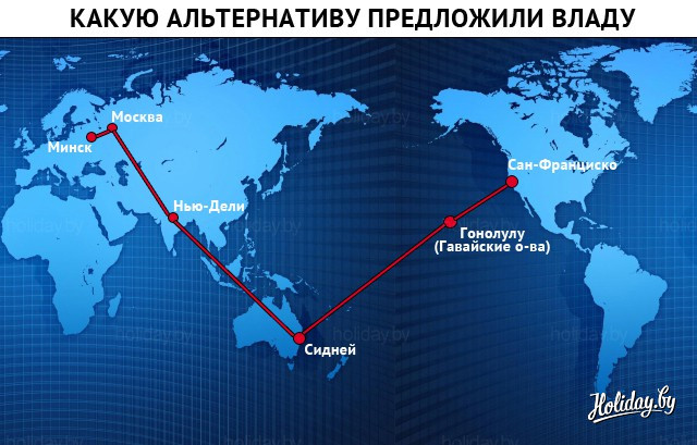 Мне предложили просто шикарный вариант, с помощью которого я мог бы добраться до Варшавы, а оттуда в Минск: Сан-Франциско-Гонолулу-Сидней-Дели-Москва-Варшава. То есть, мне фактически предлагали своеобразное кругосветное путешествие, которое бы заняло около четырёх суток. Естественно, такой вариант меня не устроил. Затем мне предложили возвращаться на таком же рейсе, что отменили, только завтра. Это тоже был не вариант, поскольку я должен был покинуть Штаты именно сегодня. В последний момент, буквально за полчаса до рейса, меня спросили: «Полетите в Лондон?» Я ответил: «Полечу!», потому что вспомнил, что в Великобритании трансфер можно пройти без визы.