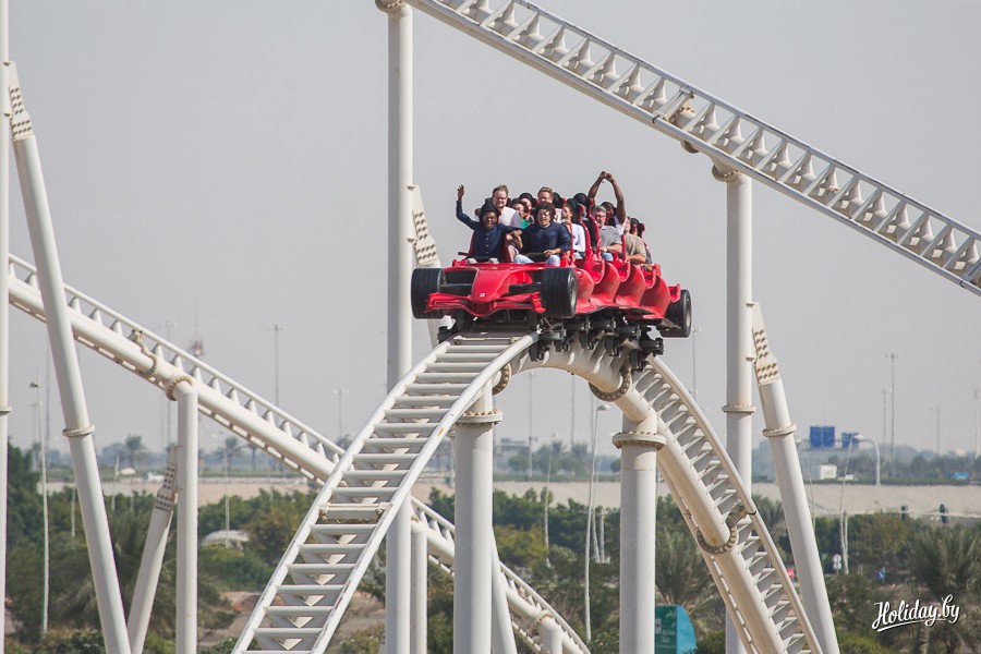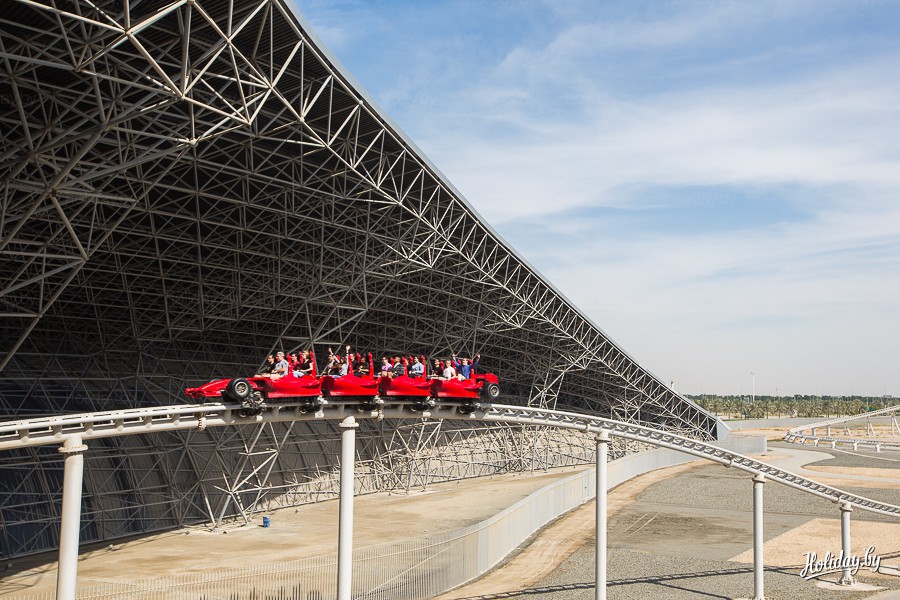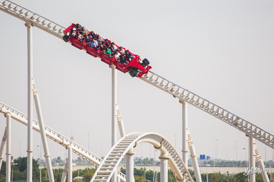Подъехала вагонетка, стилизованная под гоночный болид, — подошла наша очередь. Дальше все происходило слишком быстро, чтобы запомнить. Состав выехал наружу, несколько секунд постоял, давая нам насладиться видом, после чего сорвался с места и что есть сил устремился вперед. Следующее, что помню — мы оказались на высшей точке горки и начали падать вниз, пару быстрых поворотов — и вагонетка заехала в помещение. Вагонетка Formula Rossa проносится по рельсам за 30 секунд, причём, за первые 5 секунд она разгоняется до 240 километров.