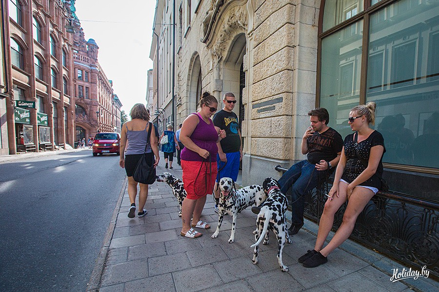 Первое впечатление от города — это туристский центр. Столпотворения впечатлённых и впечатляющихся, молодёжи и пенсионеров на двухэтажных красных автобусах зашкаливает. Видно, что в городе любят собак и берут их везде с собой: чем больше, тем лучше и веселее! Длинная шопинг-улица, много наглых попрошаек, звенящих монетами в стакане — это всё шведская столица.
