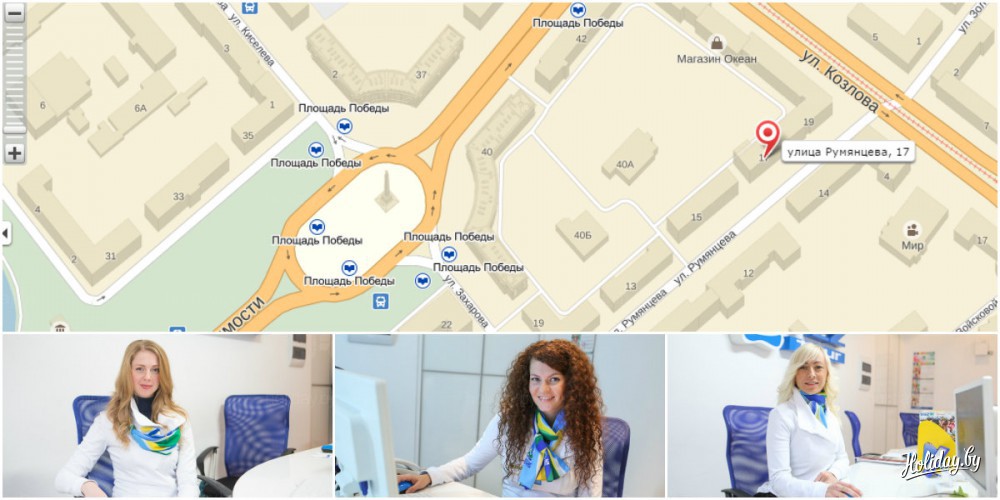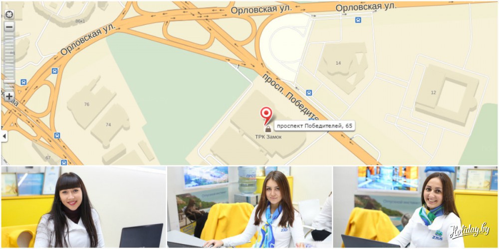 В этом офисе, оборудована детская зона, где вашему малышу предложат посмотреть мультфильм. Еще один приятный момент (характерен для всех офисов «Ривьера Трэвел») — возможность стать обладателям карточки почетного клиента. Как правило, для этого необходимо быть постоянным покупателем туров или купить путешествие на определенную сумму. Данная карточка дает вам возможность получить скидку от 5% на весь тур. В офисе на проспекте Победителей, 27 работает менеджер Татьяна Альховик, которая за прошлый год посетила более 8 направлений и готова делиться впечатлениями с туристами.