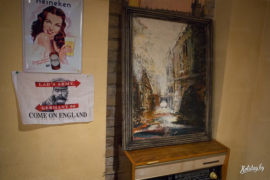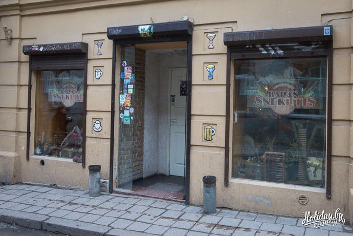 Белорусы — частые гости в «Шнекутисе», об этом можно судить по многочисленным банкнотам, развешанным по помещению. Интерьер у таверны очень простой, полки нагромождены культовыми предметами 20 века: радио, баян, советские счеты.