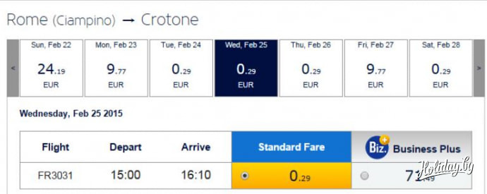 Крупнейшая бюджетная авиакомпания Европы Ryanair предлагает летать по Италии за 0.59 евро (около 10 тысяч белорусских рублей ) в обе стороны со всеми сборами. Информация с сайта ryanair.com.