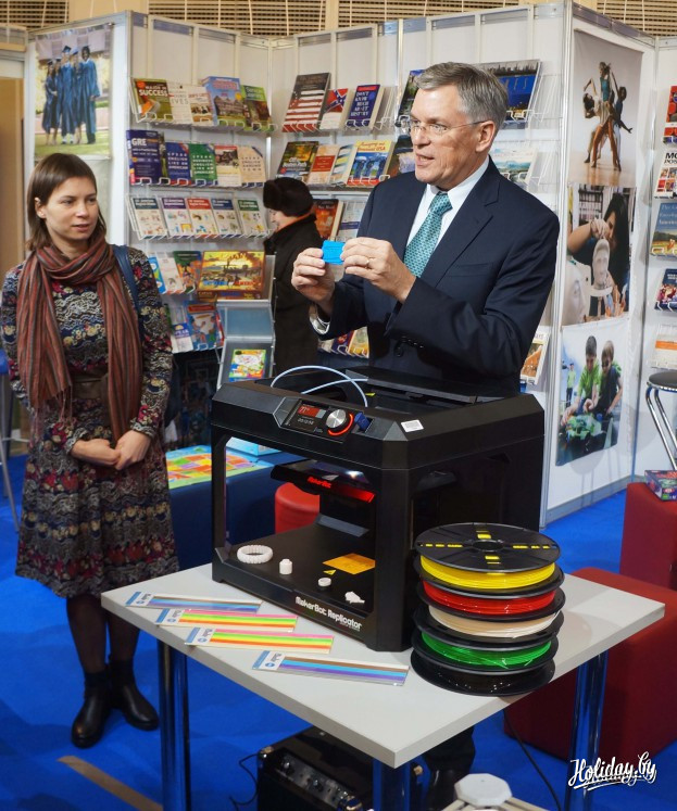 Во время презентации стенда Поверенный в делах США Скотт Роланд продемонстрировал работу 3D-принтера. Устройство за 15 минут распечатало закладку для книг.