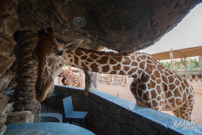 Еще одна «фишка» Emirates Park Zoo — гостиница для туристов. По периметру вольера с зебрами и жирафами расположены номера трехзвездочного отеля Emirates Park Resort. Самый простой двухместный номер стоит от $100 до $120 за ночь, стоимость зависит от сезона. Заплатив $240 вы получаете номер с видом на вольер и можете кормить животных непосредственно с балкона.