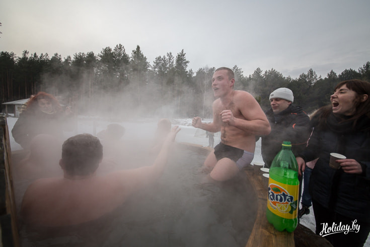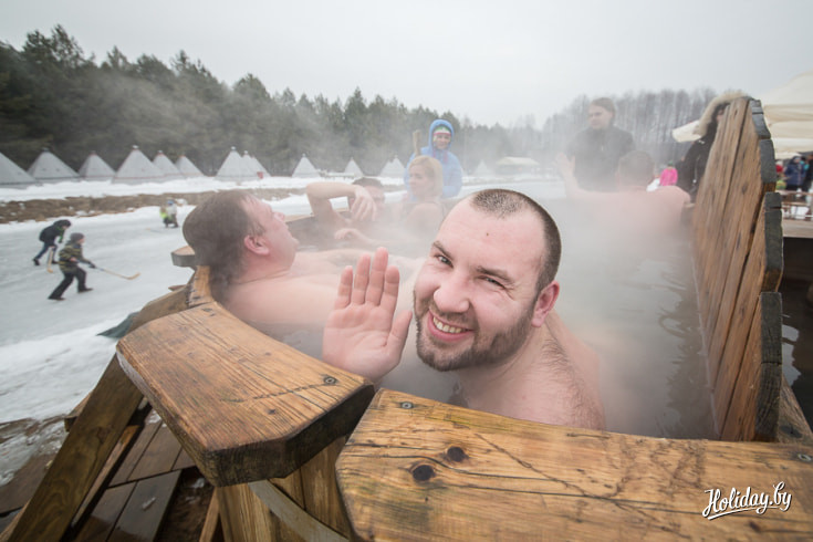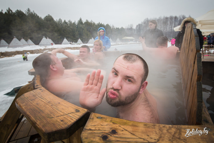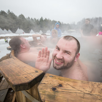 Несмотря на снег и низкую температуру, некоторые гости не побоялись окунуться японскую баню, которую ещё называют офуро. Офуро – это особая японская ванна предназначенная для банных процедур. Выглядит она как большая бочка, изготовленная из древесины различных пород: дуба, кедра, лиственницы, сосны. Воду в японской бане нагревают до 40 градусов.