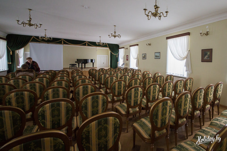 Под звуки музыки — полонез «Прощание с родиной» Людмила Гродицкая знакомит нас с театрально-музыкальным залом. Во время Михаила Клеофаса Огинского такого зала не было. Здесь умещалось несколько помещений, плавно переходящих друг в друга. В одном из них была столовая. Потом какое-то время это был так называемый композиторский зал.