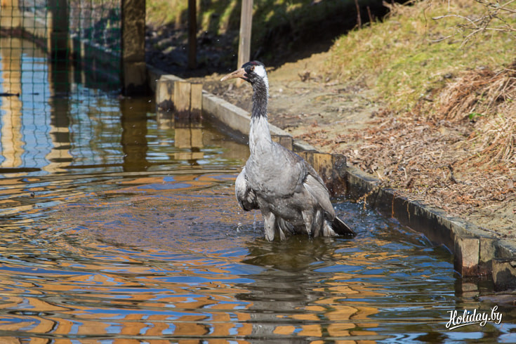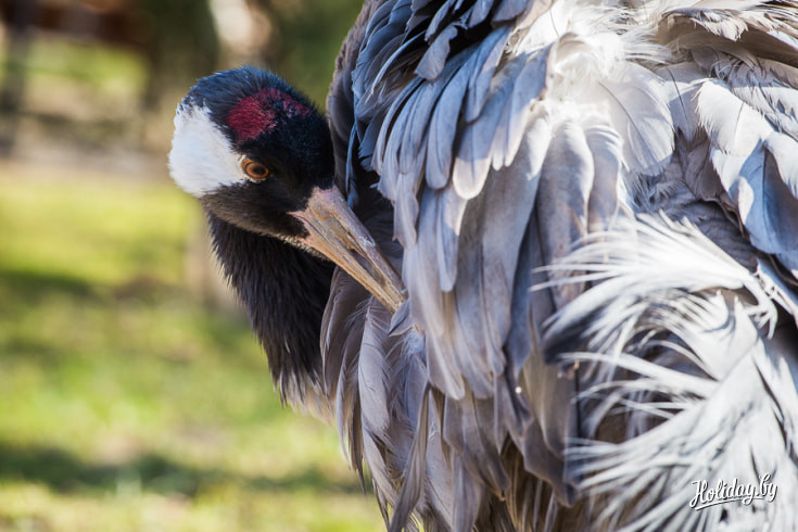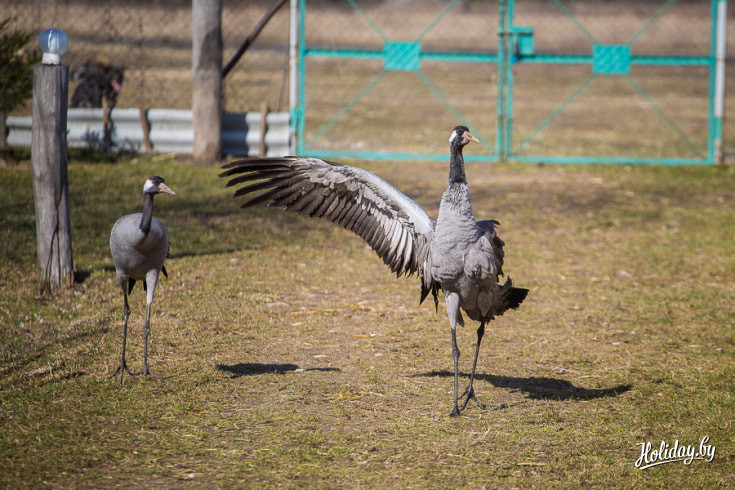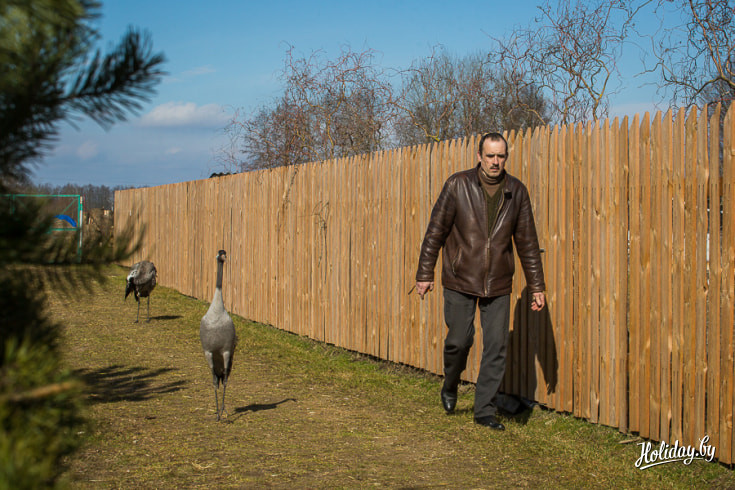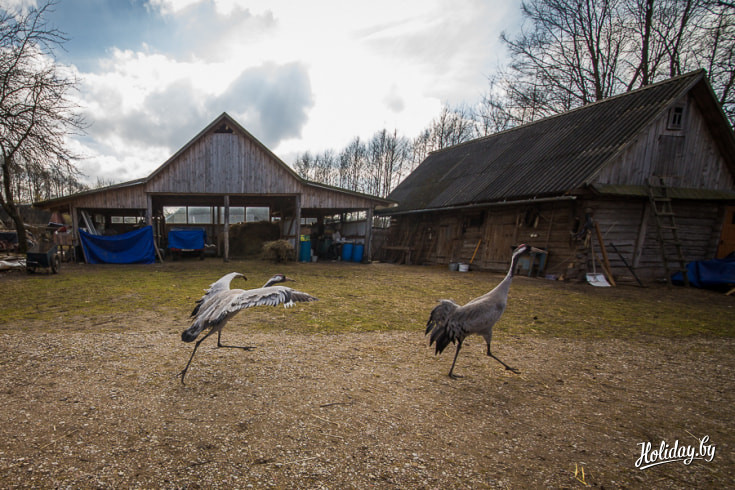 Двух журавлей купили в зоопарке ещё яйцами, их высидела индейка. Когда птенцы росли, они часто боролись друг с другом за еду. В результате самочка поранила самцу крыло. Рана загноилась и ветеринар принял решение ампутировать конечность. Несмотря на дефект, журавль чувствует себя хорошо. Вместе с самочкой он свободно гуляет по усадьбе и даже иногда устраивает танцевальные представления.