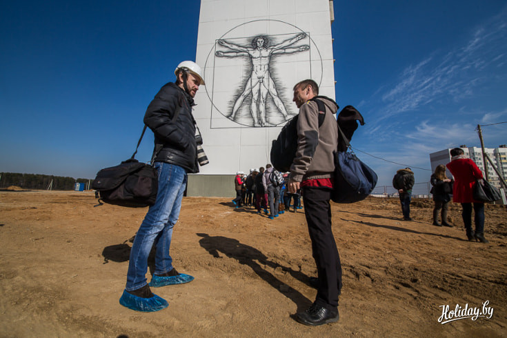 Задумка была воплощена в символичном месте: в строящемся жилом районе Новая Боровая. Здесь на стене одного из домов совсем недавно появился огромный Витрувианский человек — одно из самых известных творений Леонардо да Винчи. Автор когда-то выполнил его пером, чернилами и акварелью с помощью металлического карандаша. Современным художникам пришлось попотеть, чтобы воссоздать картину в новых масштабах. Они трудились два дня и израсходовали 20 баллончиков краски.