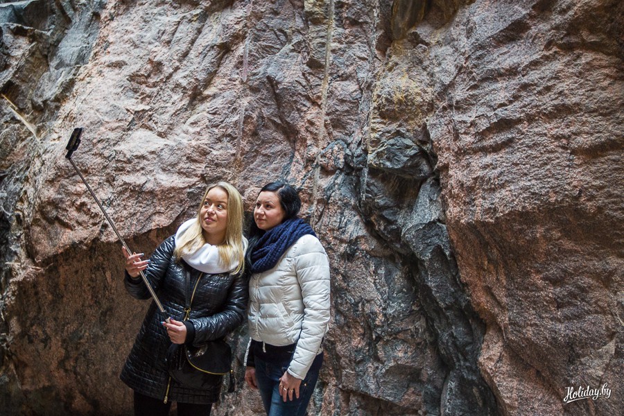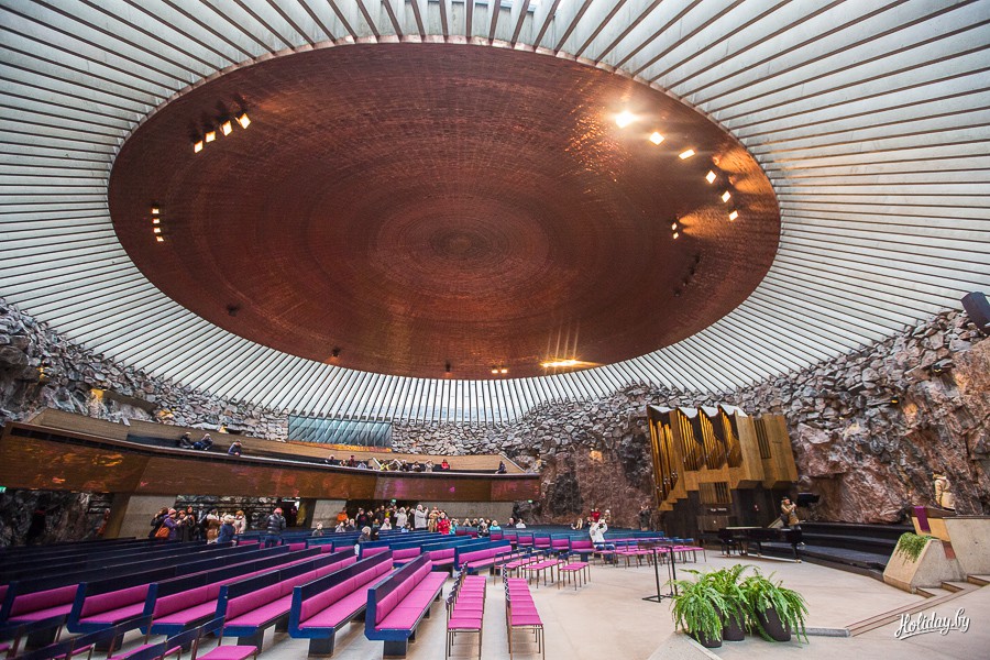 Мы как раз в очередном таком: это церковь со сложным названием Темппелиаукио, что можно буквально перевести как «в скале». Она действительно в скале! Построенная при помощи динамита и зубила – выточенная в крепкой каменной породе, на которой стоит город и вся Северная Европа – она впечатляет своими масштабами и строгим внутренним убранством. У туристов группы есть возможность побродить меж гигантских камней, из которых сложены стены храма, и вдоволь нафотографироваться в основном зале.