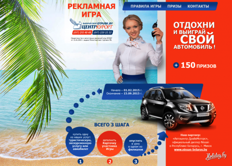 Как сообщила Holiday.by ведущий специалист отдела маркетинга и рекламы «ЦЕНТРКУРОРТ» Екатерина Ермоленко, в рекламной игре может поучаствовать любой белорус. Для этого достаточно купить путевку в санаторий или на море, а также экскурсионный тур или авиабилет в компании «ЦЕНТРКУРОРТ».