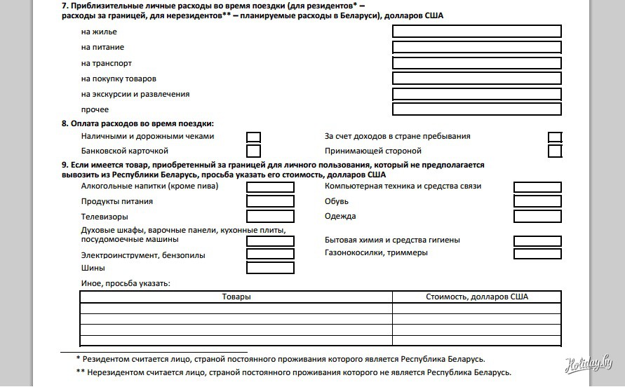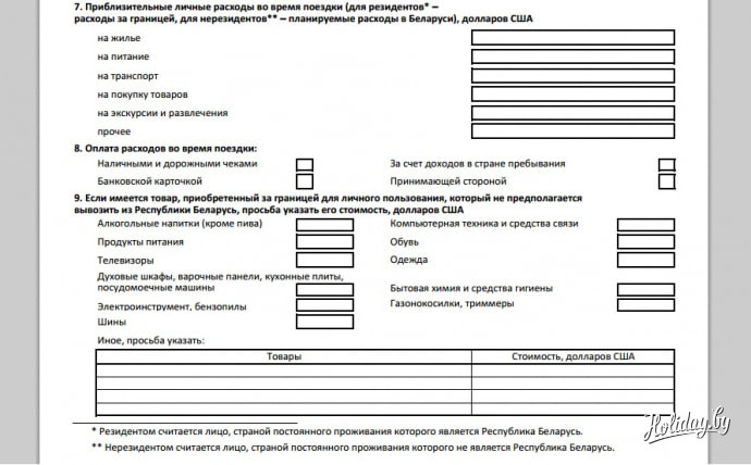 Все граждане, пресекающие границу в этих пунктах, должны заполнить анкету, в которой распишут цель поездки, приблизительные личные расходы, а также указать товары, приобретенные за границей для личного пользования, которые не предполагается вывозить из Республики Беларусь.
