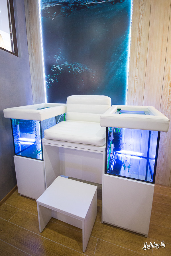 Удивит посетителей и ихтеотерапия или ФИШ-СПА. Суть ее в том, что множество маленьких индонезийских рыбок со всех сторон облепливают руки или ноги клиента и соскабливают с его кожи ороговевшие частички. Кроме того, это и самый настоящий микромассаж. Таим образом, нормализуется кровообращение, происходит психоэмоциональная разгрузка и проводится природный пилинг.
