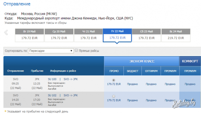 Авиакомпания «Аэрофлот» ввела спецпредложение для полетов в Нью-Йорк из Москвы и Санкт-Петербурга. Стоимость билета туда-обратно с учетом сборов составляет соответственно 351 и 412 евро. Цена действительна при условии покупки билета туда-обратно.