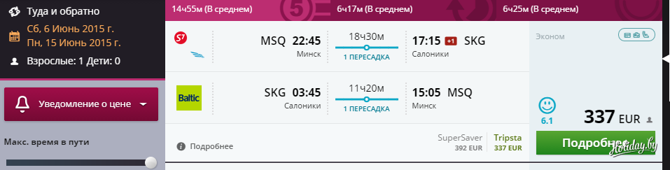 За девять ночей в городском отеле просят €231. Ехать до хорошего пляжа придется на общественном транспорте, сменяя 2-3 автобуса. За перелет Минск-Салоники-Минск с пересадкой придется отдать €674 (на двоих). Альтернатива — вылет из Вильнюса, тогда два билета Ryanair стоят €392. Хорошая цена, если бы не длительность перелета — 23,5 часа в одну сторону.