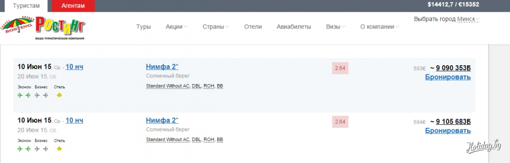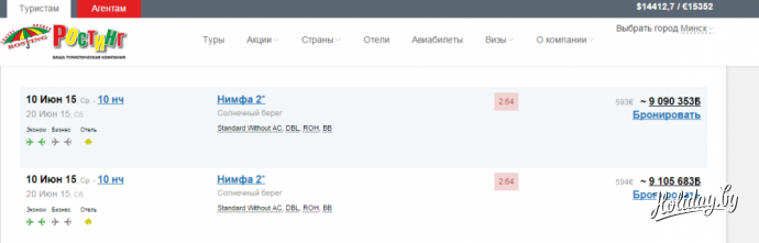 | Пакетный тур | от 16,3 млн. бел. руб. ($1143) | от 9,1 млн. бел. руб. (€595) | от 15,6 млн. бел. руб. (€1019) |