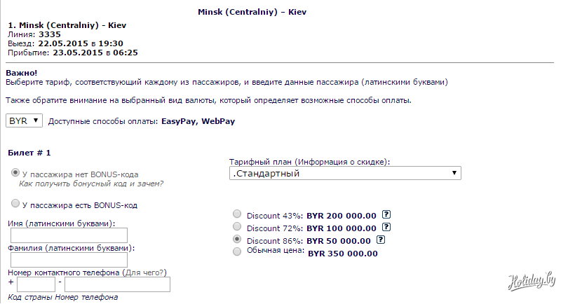 Скидки по маршрутам Минск-Киев-Минск и Минск-Одесса-Минск установлены на период поездок с 22 мая по 07 июня. Билеты в продаже с 23 апреля.