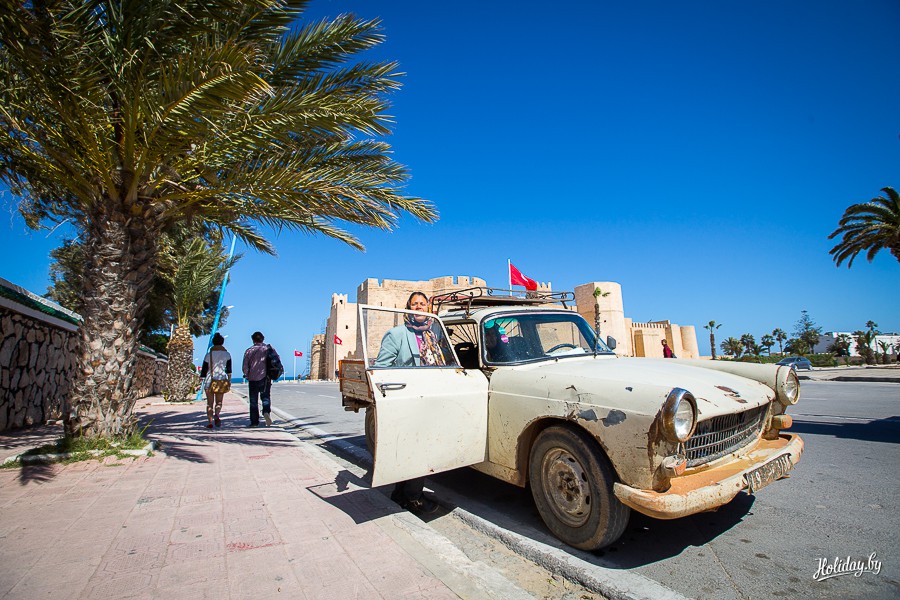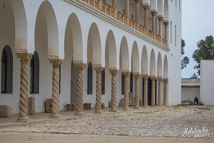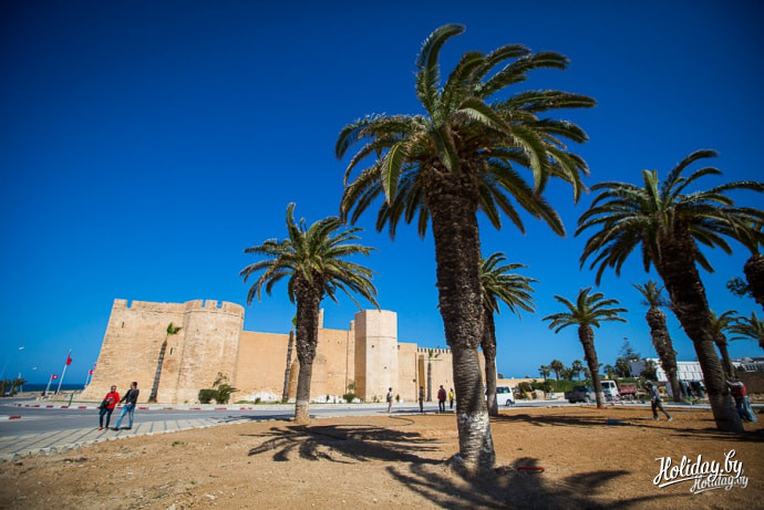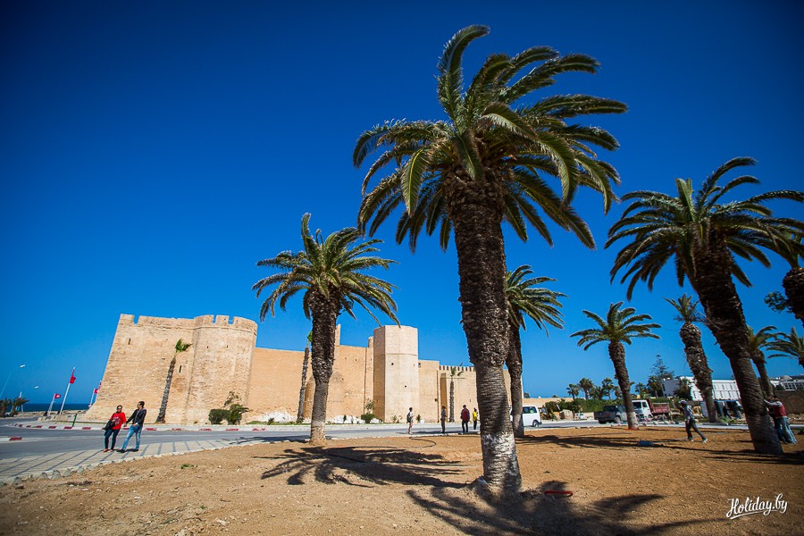 Еще одна достопримечательность Монастира — арабская военная крепость Рибат. Пока она находится на реконструкции, поэтому ее нам посетить не удалось. Зато мы увидели, как готовят к сезону улицы города. На одной из них подстригали пальмы, чуть дальше —украшали площадь флажками.