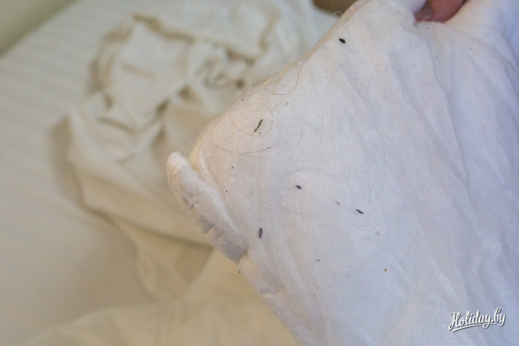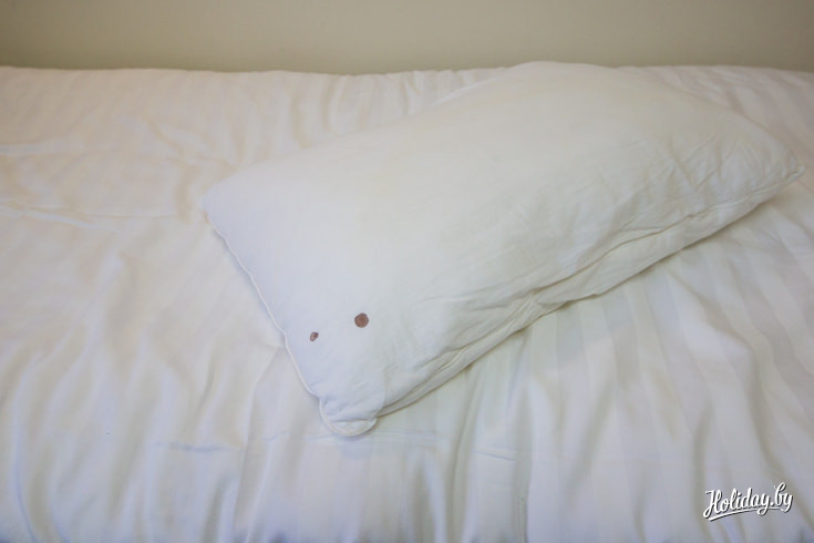 Перешли к спальному месту. Белье старательно выутюжено и приятно на ощупь. Но то, что под ним – это позор для гостиницы. Подушка в пятнах (очень уж напоминающих капли крови, хотя, возможно, это просто виноградный сок), одеяло в жутком состоянии, полностью усыпано волосами. Все это существенные минусы, а ведь сама кровать удобная, с качественным и чистым матрасом.