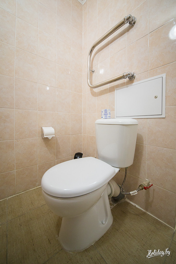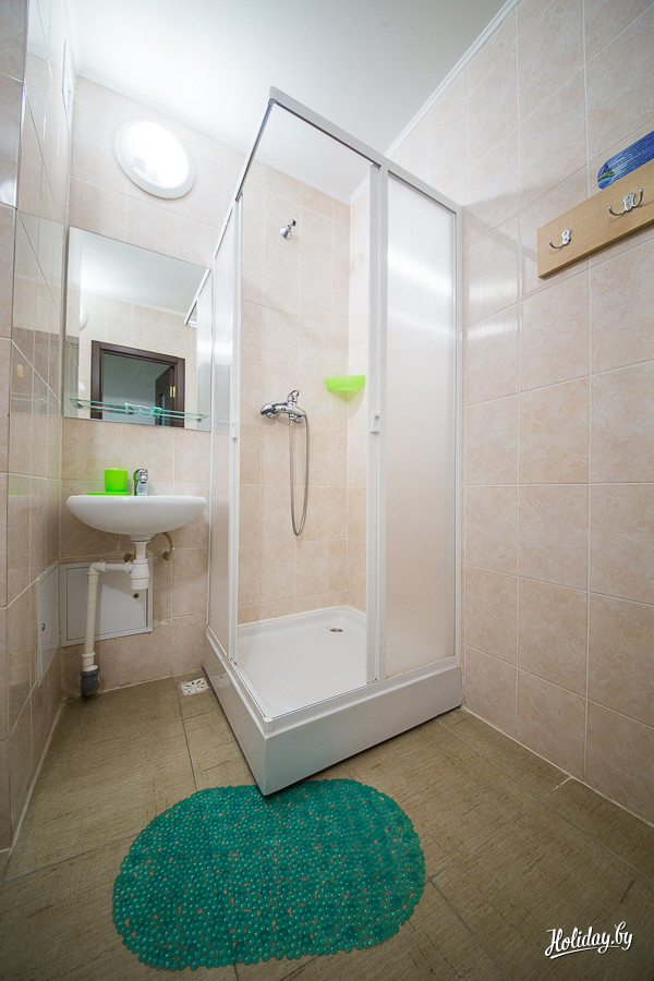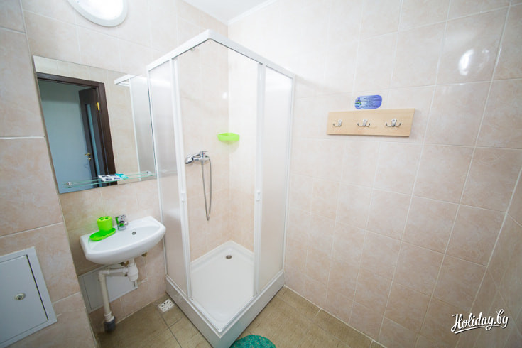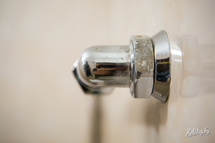 Мелкие небрежности присутствуют повсюду. С карниза забыли стереть строительные карандашные пометки, батарея и стены в ванной комнате местами вымазаны цементом… кстати, о ванной комнате: она встретила нас наспех зашлифованной дырой на потолке. Но в остальном тут довольно чисто и приятно. Гостям предоставляются одно большое и одно маленькое полотенце, а также гель-душ, шампунь и мыло. Шкафчиков нет, только крючки. Сантехника работает исправно. Правда, горячую воду необходимо какое-то время подождать. Появляется она далеко не сразу. Фена нет, как нет здесь и розетки для него.