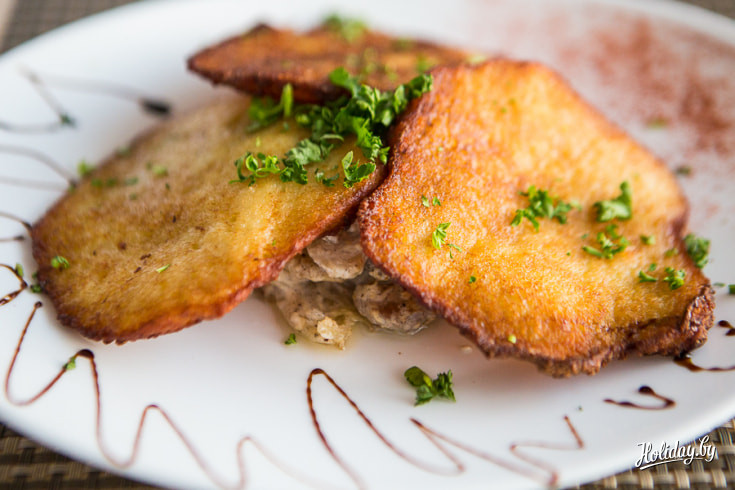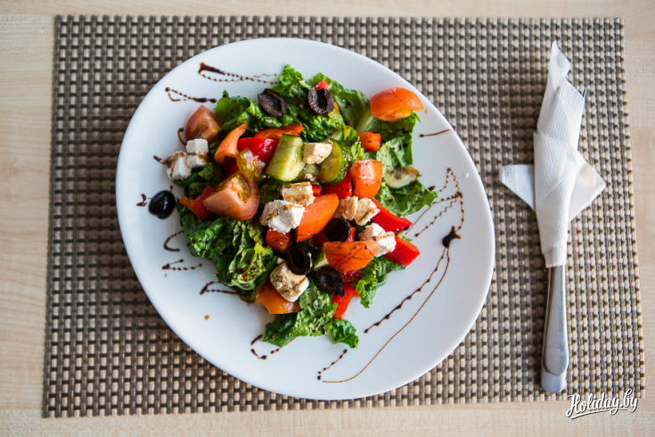 На ужин мы отправились в гостиничное кафе. Интерьер здесь точно не претендует на гордое звание ресторана, но все аккуратно и вполне достойно. Заказали греческий салат (47 800 рублей), крем-суп из брокколи (16 700 рублей), драники со свининой и грибами (78 500 рублей) из раздела меню с белорусской кухней и два капучино (20 200 рублей – за один). Общий счет составил 183 400 рублей. Обслуживала нас очень приятная девушка. Вообще стоит похвалить местный персонал за умение улыбаться и внимательно относиться к гостям.
