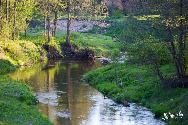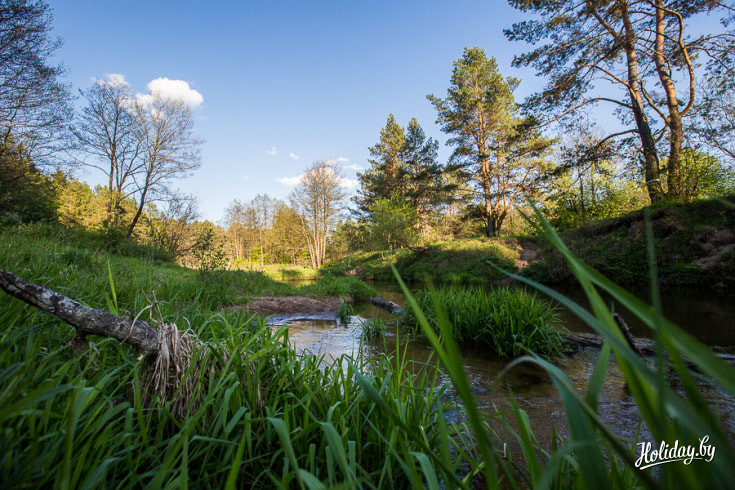 Не доезжая до деревни Киевец мы свернули в лес. Спустя пару минут и несколько кочек, которые на мотоцикле ощущаешь ещё сильнее, чем на авто, мы выехали на поляну возле Ислочи. Говорят, здесь водится форель и хариус. Место известно и тем, что в 2013 году неподалеку от этой поляны в Ислочь упал КАМАЗ, в результате район реки ранее пригодный для купания и ловили рыбы, был подпорчен топливом и маслом.