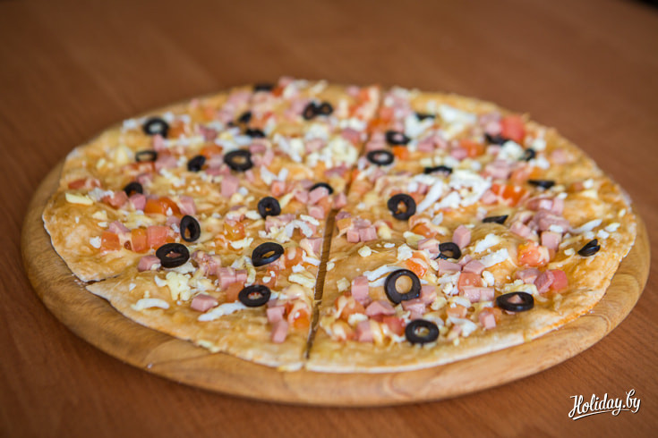 Пиццу «Аппетитную» приготовили за 7 минут, подали её на деревянной тарелке. Выглядело блюдо хорошо, а вот вкус разочаровал — тесто оказалось прокисшим и перебивало вкус всех остальных ингредиентов. Салат с овощами, крабовыми палочками и рисом также был не первой свежести. А вместо заявленного борща за демократичные 6 100 рублей, нам подали щи. Самым вкусным блюдом оказалось желе.