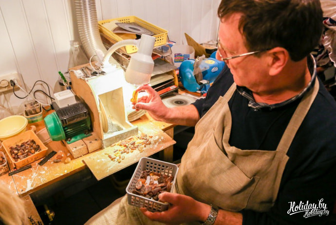Лучше всех знают и понимают янтарь, конечно же, янтарные искустники. В Паланге несколько янтарных мастерских. Мы навестили одну из них и узнали, что, оказывается, существует янтарная настойка, которая состоит из горсти необработанных солнечных камней и какого-нибудь крепкого напитка. Говорят — это настоящая панацея от всех болезней. Ничего в производстве мастеров не выбрасывается. Даже янтарная стружка идет дело. Ею можно чистить зубы, а еще это прекрасный пилинг для кожи. Если очень хочется можно попробовать обработать камень самому. Правда, необходимо быть крайне осторожным, чтобы не поранить руки.
