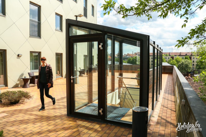 Шарунас устроил нам небольшую экскурсию по своим владениям. Отель «Каунас» предлагает как стандартные номера, так и номера представительского класса. Совсем недавно здесь был обновлен интерьер, везде чисто и уютно, как и положено хорошей гостинице. В распоряжении гостей также фитнес-зона и большая открытая веранда на одном из этажей, откуда можно любоваться окрестностями. Кроме того, в «Каунасе» есть все условия для проведения бизнес-встреч, семинаров и конференций. Отель предоставляет зал и профессиональное обслуживание.