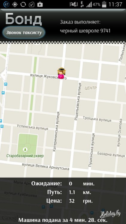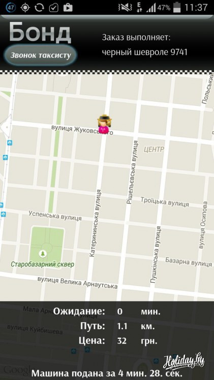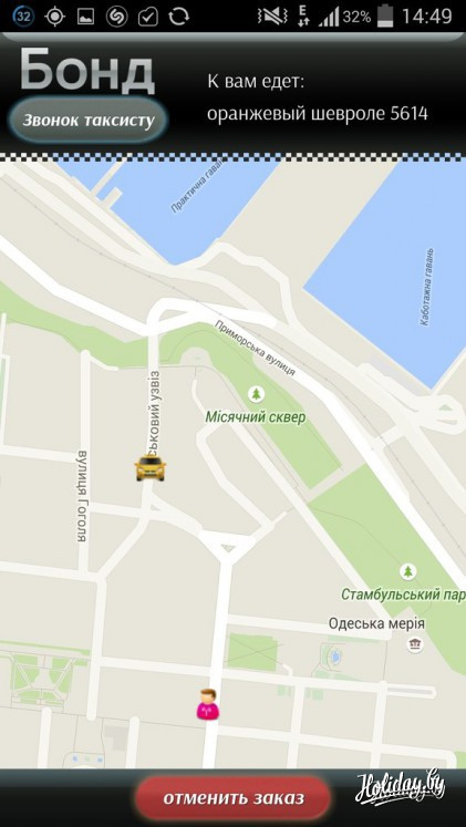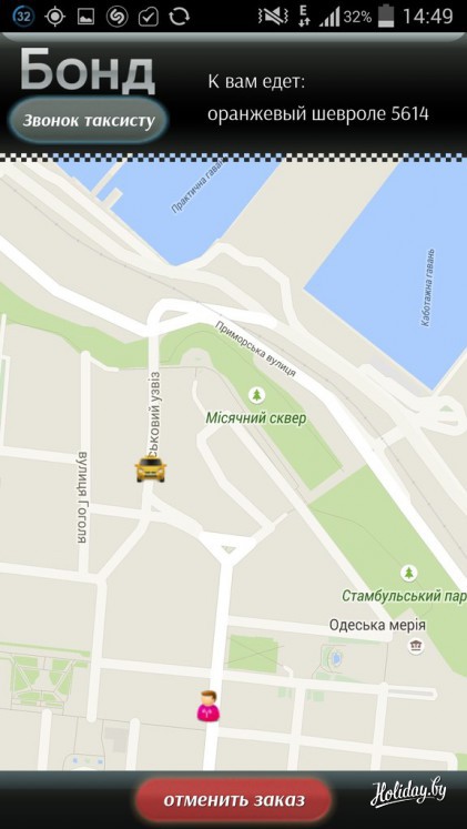 Удобнее и безопаснее всего вызывать машину в Одессе по приложению службы такси «Бонд», аналогичное работает в Киеве. Включаешь интернет и геолокацию, указываешь адрес, и телефон сам определяет местоположение, после чего на экране появляется карта: в одном углу ваше месторасположение, в другом автомобиль. Приложение может рассчитать стоимость поездки и сохраняет данные каждого таксиста.