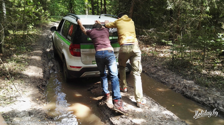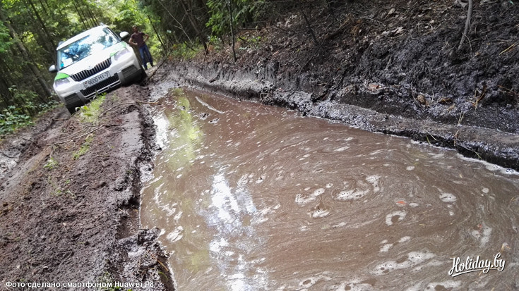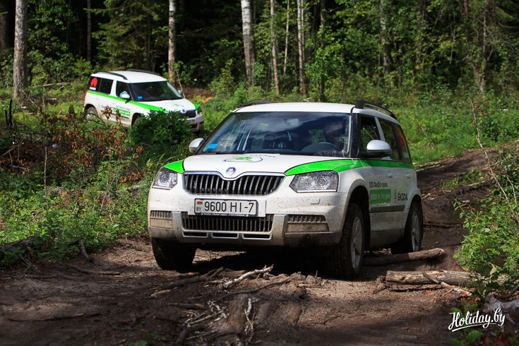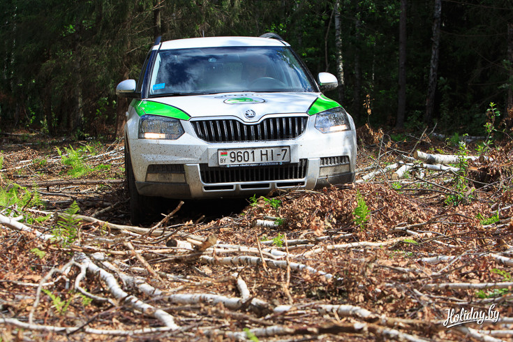 Мы не из пугливых, поэтому все же решили осмотреть Острова Дулебы изнутри. И ехать пока не остановимся. Не зря же отправились в экспедицию на кроссоверах Skoda Yeti – это их день. Наша экспедиция перемещалась на двух автомобилях - полноприводном с двигателем 1.8 л, и переднеприводном «Йети» с турбомотором 1.4 TSi, который вызывал у нас гораздо больше опасений в плане преодоление препятствий. Ведь дорогу, которую мы разведали заранее проложил… его величество МАЗ-лесовоз. Короткий, но ёмкий инструктаж от джип-инструктора Игоря Губаря перед съездом на просеку о том, как верно себя вести за пределами асфальта. И повернуть обратно шансов нет, даже физически. Всё из-за вплотную подступающего к машинам леса. Нам очень повезло с белорусской засухой. Пройди накануне один-другой дождик мы бы точно сидели в глубокой колее в обнимку с кровососущими насекомыми. С сухой колеей Skoda Yeti справился с относительной легкостью, прокатившись по гребню и цепляясь за бревна. Пару раз пришлось подтолкнуть переднеприводного товарища, так как двигатель 1.4-литрового объема не сильно тяговит на нижних оборотах. К тому же механическая коробка передач не добавляет радости неопытным водителям на такой дороге.
