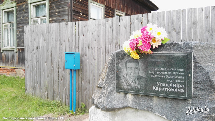 Дом получилось осмотреть только снаружи, попасть внутрь нельзя — в нем живет племянник Короткевича. В трех метрах от калитки установлен мемориальный камень, на котором выгравирован портрет Короткевича.