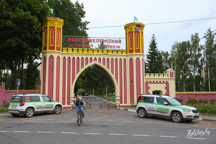 Захватив с собой несколько банок сгущенки, чтобы сгладить впечатления о Рогачеве, двигаемся дальше. Проезжаем 38 километров, минуем Жлобин, и делаем остановку у яркой массивной брамы, выполненной в неоготическом стиле в деревне Красный Берег.