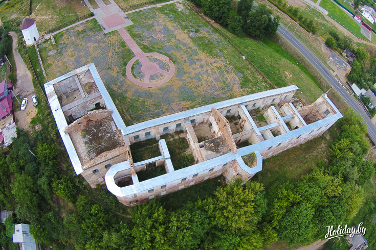 Быховский замок, который сейчас затянут тентом, некогда представлял собой громадный 800-метровый вал с бастионами и рвом в виде полукруга. Укрепление надежно защищало Быхов и принесло ему славу непреступной крепости. Замок был воздвигнут в начале XVII века. Строительство в 1610 году начал Ян Ходкевич, а заканчивал уже Лев Сапега.