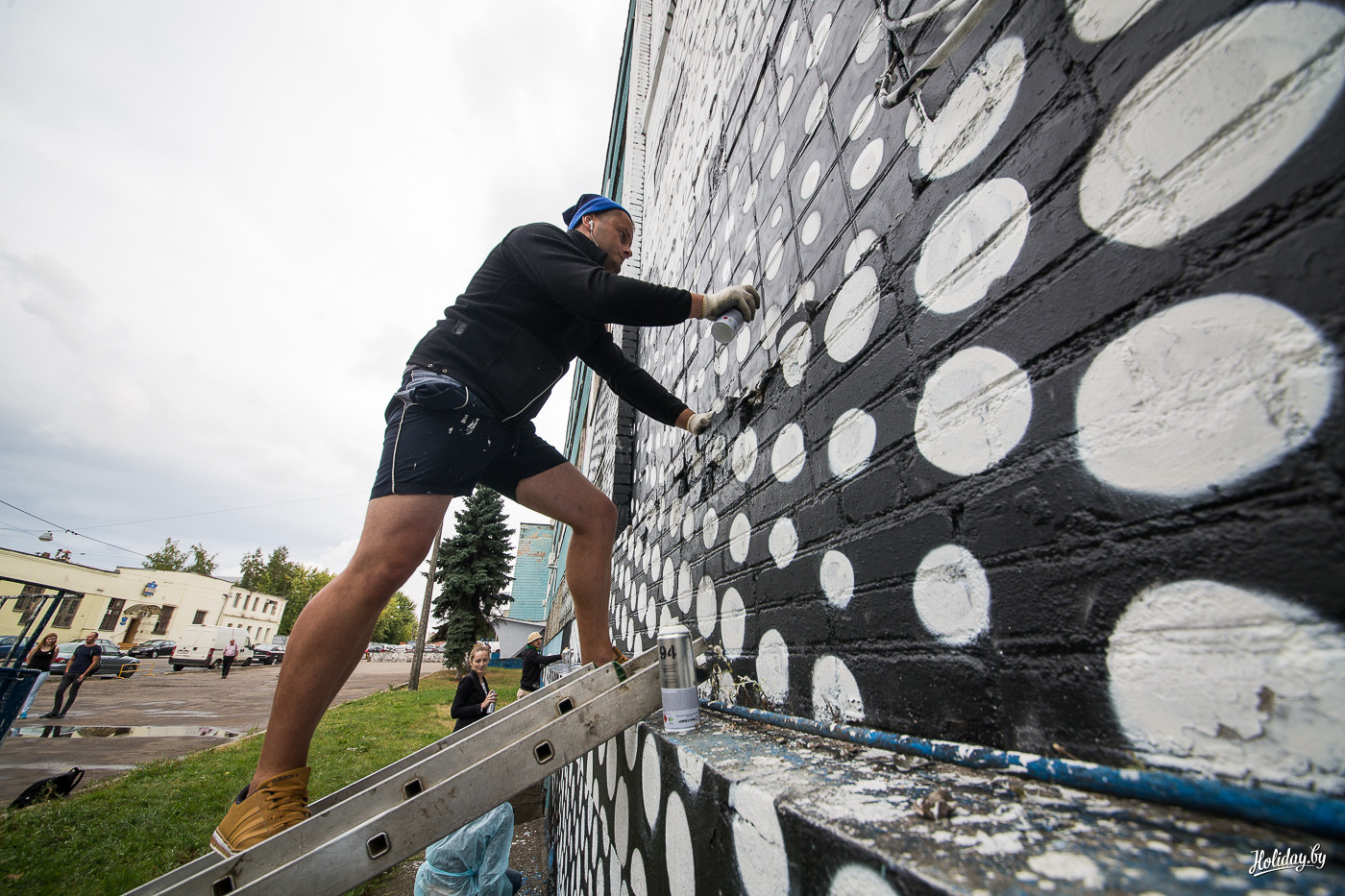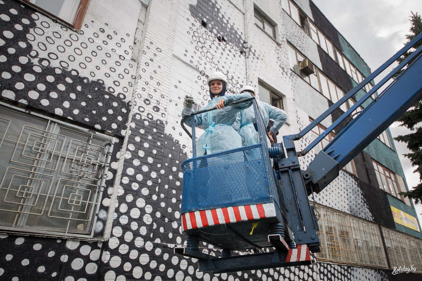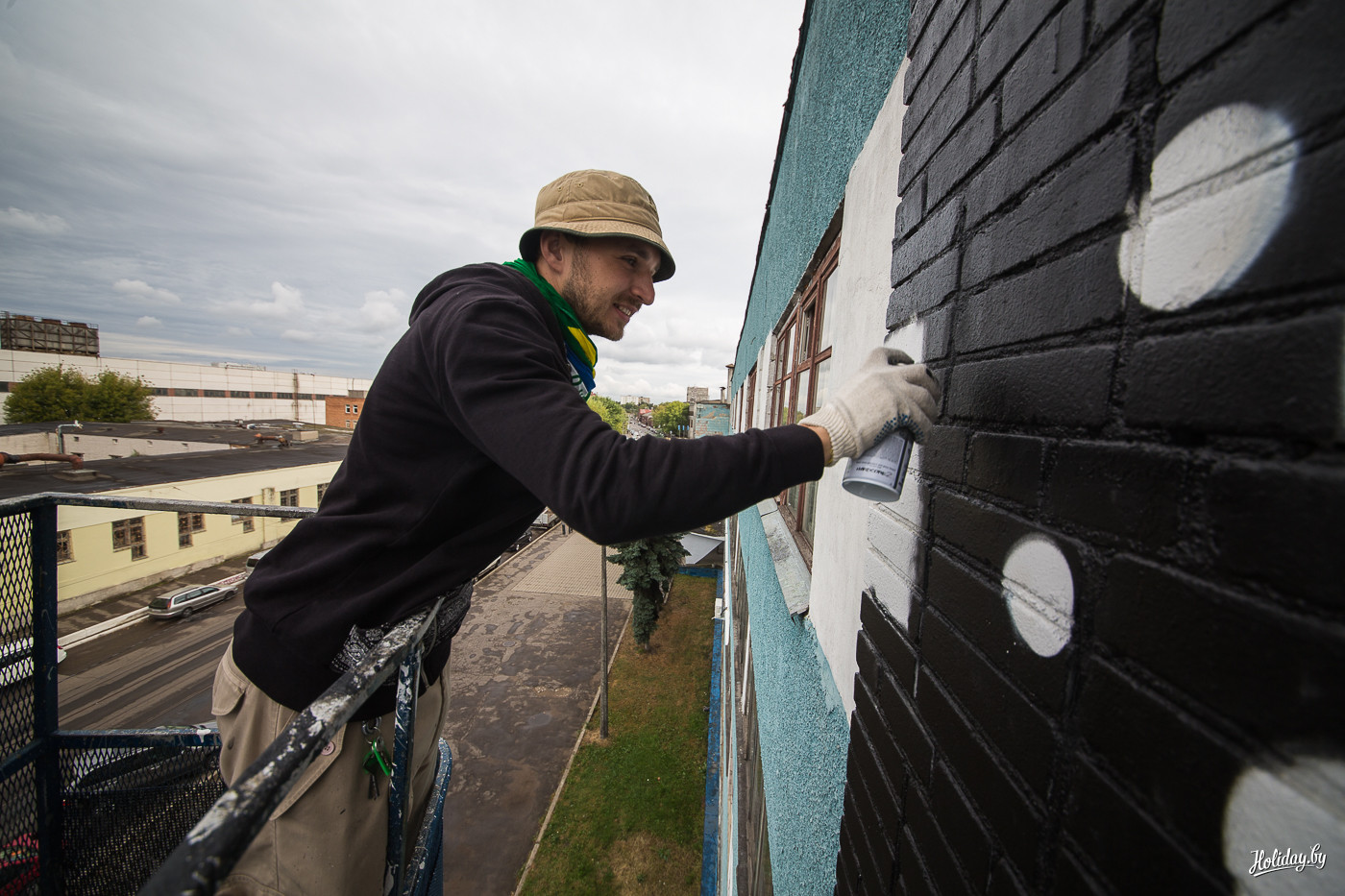 Над созданием черно-белого портрета мэра работает белорусский граффитист Сергей IZUM, помогает ему коллега Илья. А сегодня поучаствовать в создании настенной живописи пригласили журналистов и блогеров.