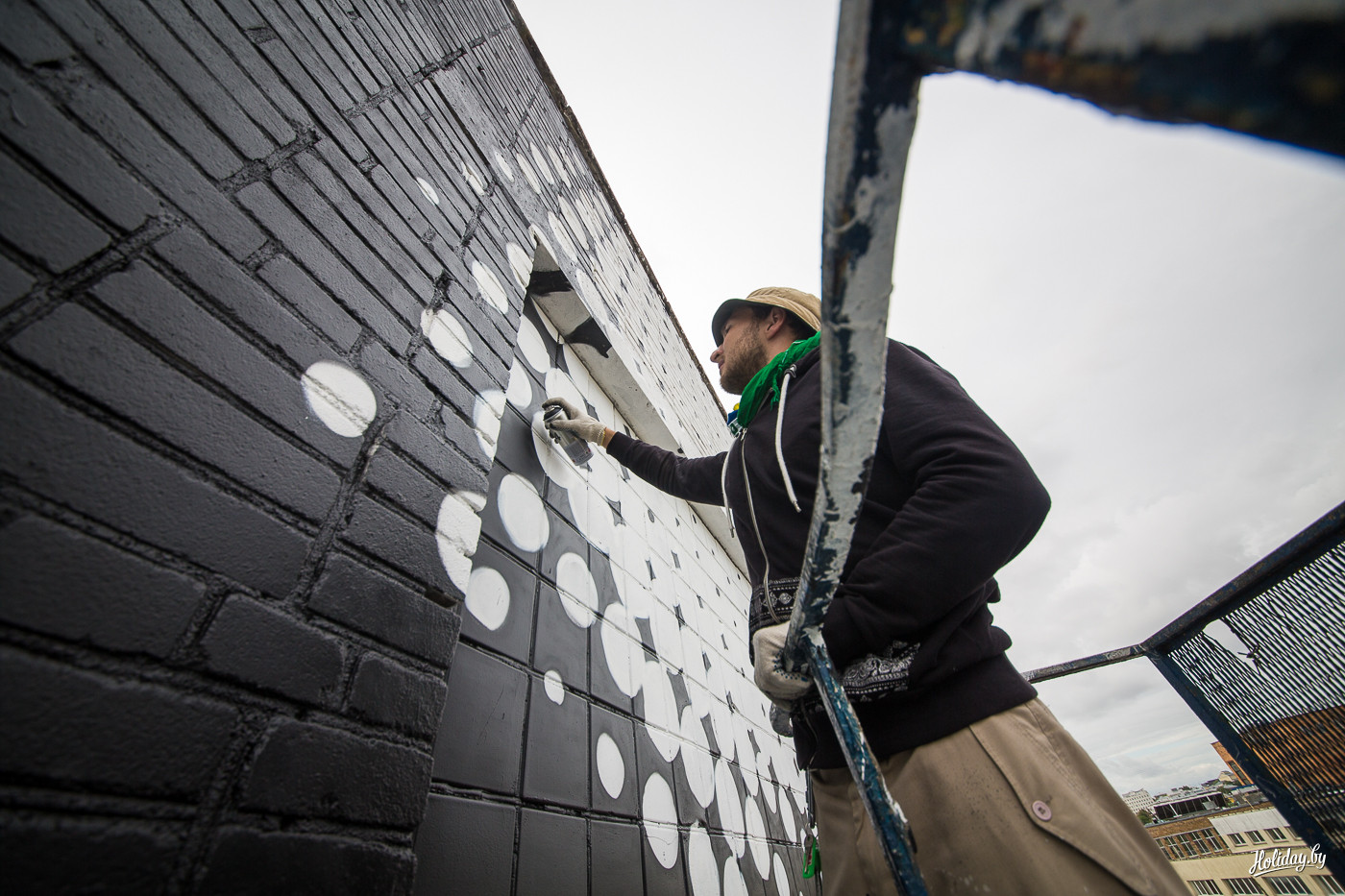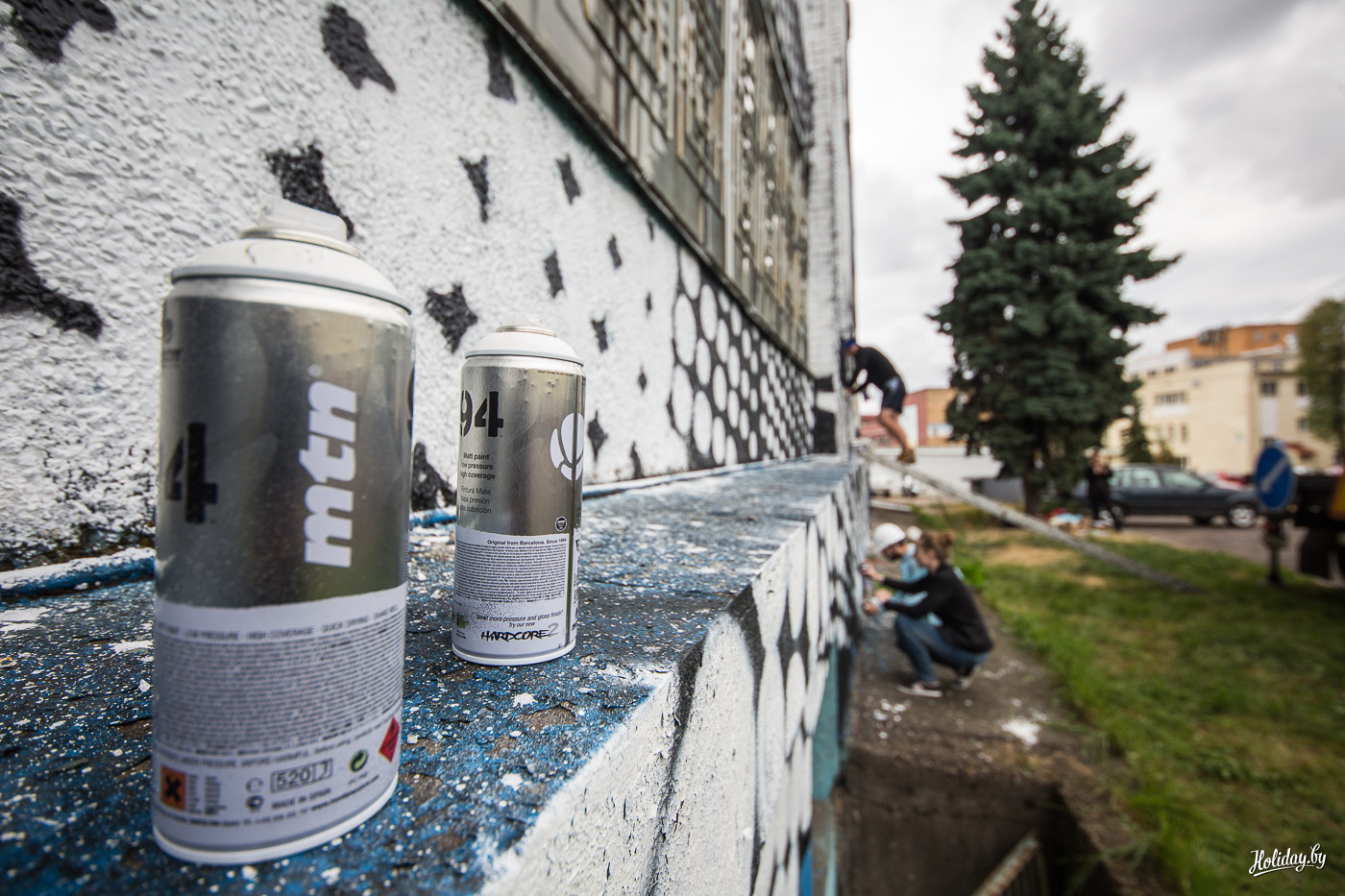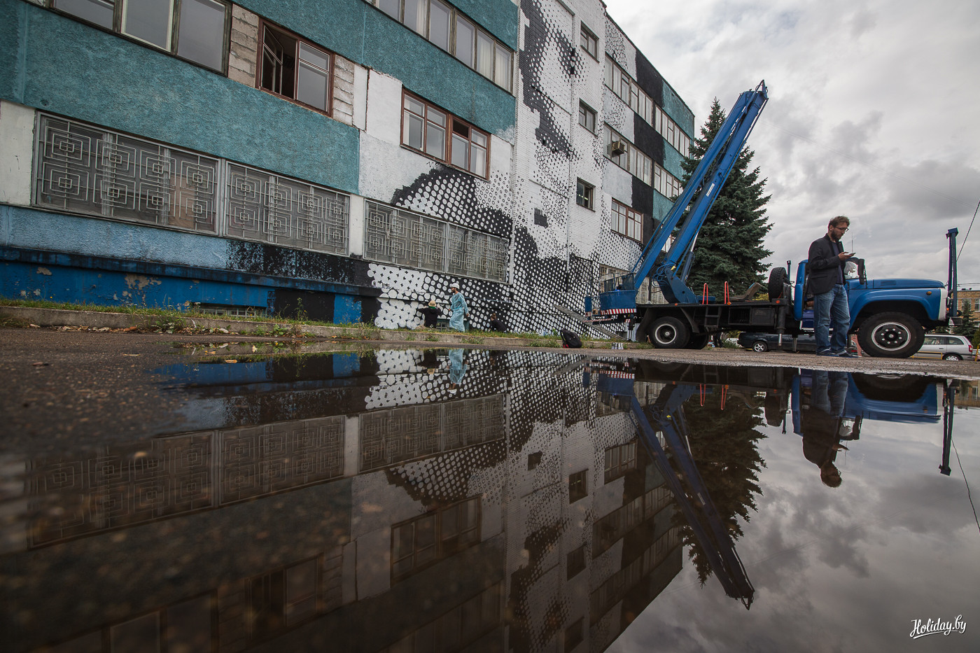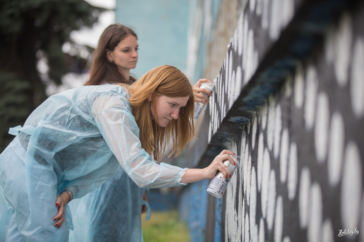 Над созданием черно-белого портрета мэра работает белорусский граффитист Сергей IZUM, помогает ему коллега Илья. А сегодня поучаствовать в создании настенной живописи пригласили журналистов и блогеров.