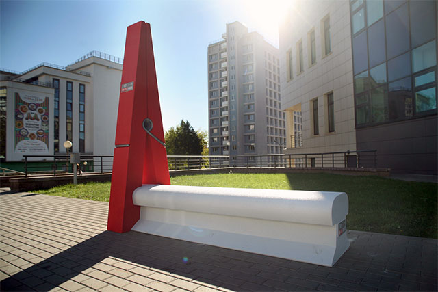 Арт-скамейка выполнена в виде прищепки, ее создатель – художник Игорь Леонтьев. Инсталляция отсылает к временам расцвета меняльных лавок.