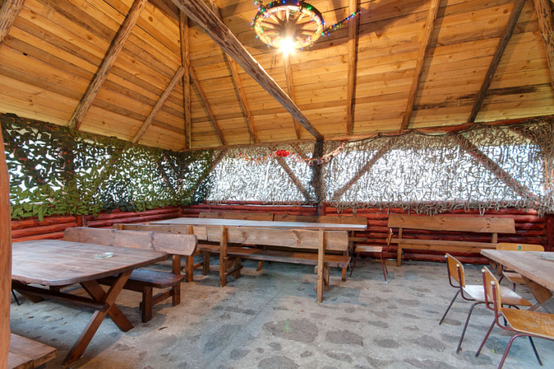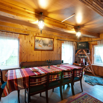 Кроме основного, на участке усадьбы построен колоритный охотничий домик с печкой и гитарой. Всего в усадьбе двадцать спальных мест.