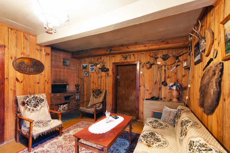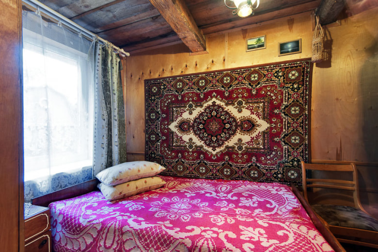 Сам дом сделан из натуральной древесины и оформлен в стиле уютного бабушкиного закутка, где всегда тело и пахнет свежей выпечкой: деревянные панели на стенах, кирпичная печь, камин, ну и, конечно же, ковер на стене. Наверняка у вашей бабули был или даже все еще есть такой же. Кстати, раньше настенные ковры считались признаком богатства семьи.