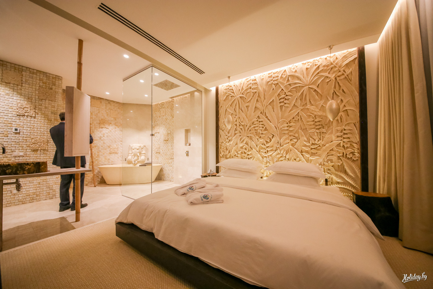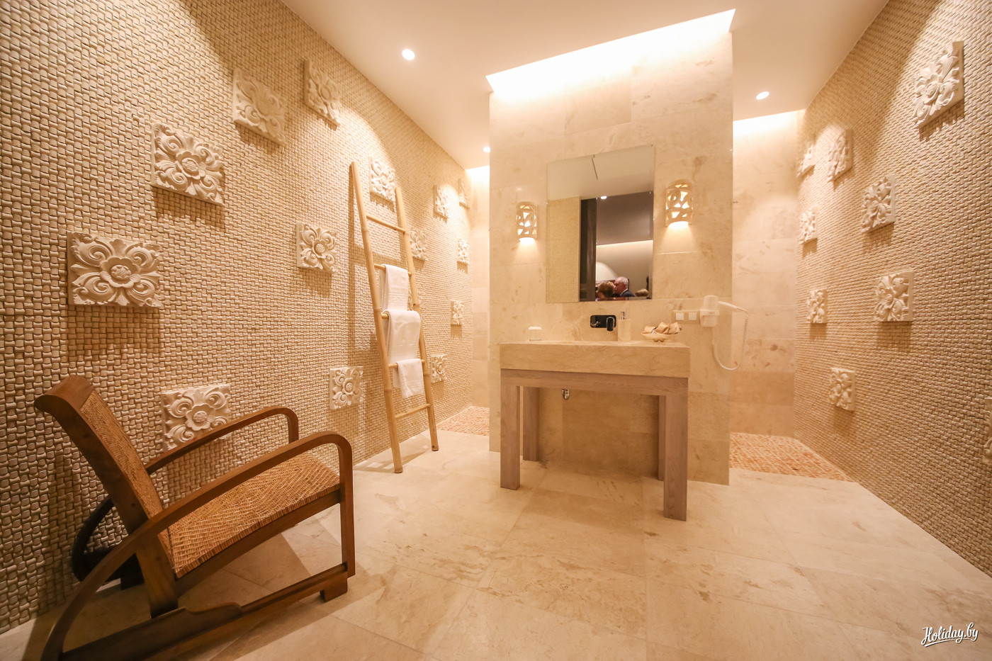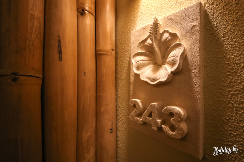 Все, кто был на открытии отеля, то и дело обращали внимание на материалы в номерах. Здесь вам и бамбук на стенах, ковры из бамбуковых листьев, ракушник, какое-то чудное индонезийское дерево или шлифованный далёким морем камень на стенах. Номера не осматривали, а ощупывали скорее. В брошюре отеля есть отличная метафора: "природа и человек здесь перемалываются как в миксере и взаимно проникают друг в друга, образуя философию отеля Flores". Надо признать, архитекторам удалось добиться этого ощущения.