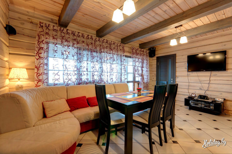 Этот вариант встречи нового года наименее модный из всех, представленных в этом материале. Но, он отлично подойдет для людей, которые привыкли отмечать новый год не «па-багатаму», а просто в свитерах и с улыбкой на лице. Деревянные стены, кровати, столы и стулья, кухня, барбекю, мангал и, конечно же, озера – вот то, что могут предложить вам в гостевых домиках на озере Нарочь. Ах да, фишка этой усадьбы: настоящий сеновал на чердаке!