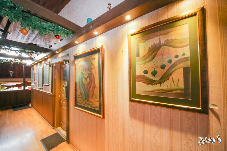 Между блюдами можно и нужно пройтись по самому ресторану. Во-первых, посмотреть и может быть прицениться к картинам Клайдаса, которые развешаны по стенам. Во-вторых, посмотреть на ювелирные работы руки хозяина заведения и также приобрести на память. В интерьере есть много необычных вещей. Например, огромная рыба под потолком, вся усыпанная янтарем. Такую сделали к очередному празднику корюшки.