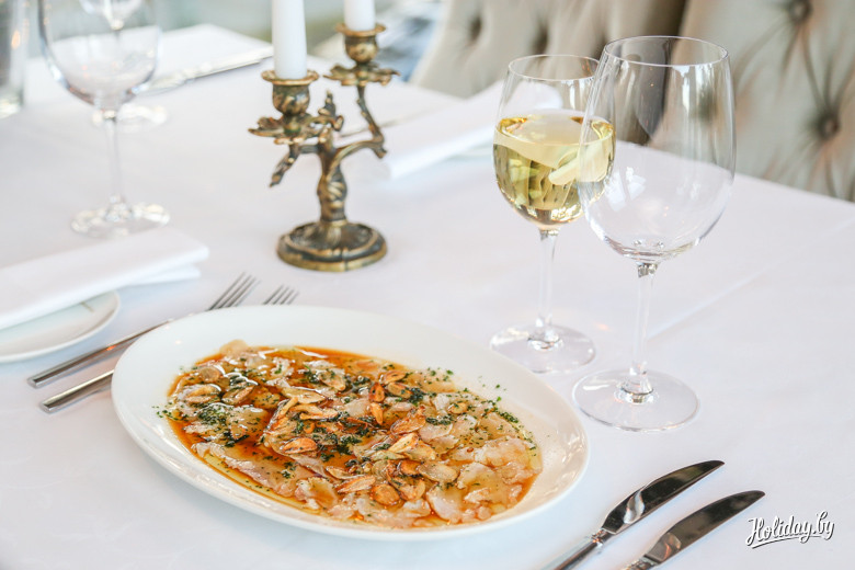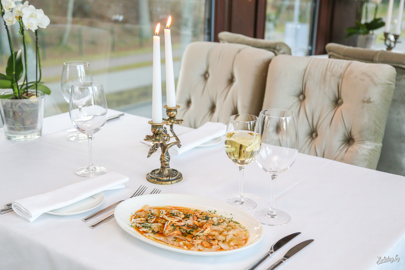 Считается, что "В тени сосен" - один из самых дорогих ресторанов Паланги, который работает вот уже 18 лет. Цены в меню мне показались не шокирующими, а просто выше среднего на курорте. Например, салат "Цезарь", карпаччо из дорады и рекомендуемый Ингридой бефстроганов обойдутся в 36 евро. Самыми дорогими позициями являются омары на гриле и закуска из снежного краба - каждое блюдо около 50 евро. Горячие блюда стоят от 15 до 50 евро на человека. При этом порции, надо понимать, будут немаленькими.