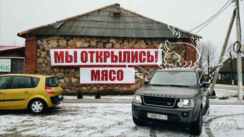 Проехав пару километров, мы убедились в креативности жителей Бегомля: «Мы открылись! МЯСО!». Такие растяжки висели на стене одного из магазина.