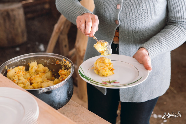 Так как гостевой домик усадьбы находится поодаль от самой фермы, хозяева решили устроить нам прием пищи на свежем воздухе. Мы помыли руки и уселись за деревянный стол. Хозяйка заботливо подала на стол главное блюдо: картошку и все умолкли, потому что было слишком вкусно, чтобы говорить.