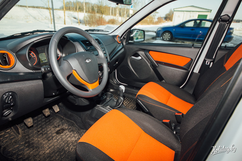 Ещё в городе я высоко оценил две вещи – высокую посадку водителя и хорошую обзорность. Сидения «Калины Кросс» хоть и блещут оранжевыми а-ля спорт вставками, но не могут похвастаться развитой боковой поддержкой и настройкой по высоте. При этом их жесткостью я остался доволен, так как всегда предъявляю высокие требования к посадке за рулем. Просто за руль крепче держишься в поворотах :) Наружные зеркала пусть и настраиваются по-дедовски рычажками на дверях, но они правильно большие и вместе с салонным зеркалом заднего вида дают максимальную обзорность.