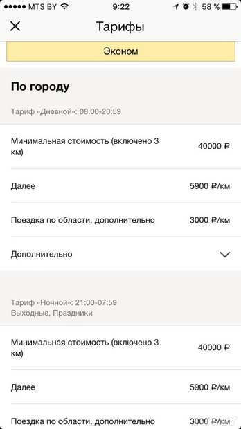 40 000 – за посадку и первые три километра, 5 900 – последующие километры в городе и 8 900 за МКАДом.