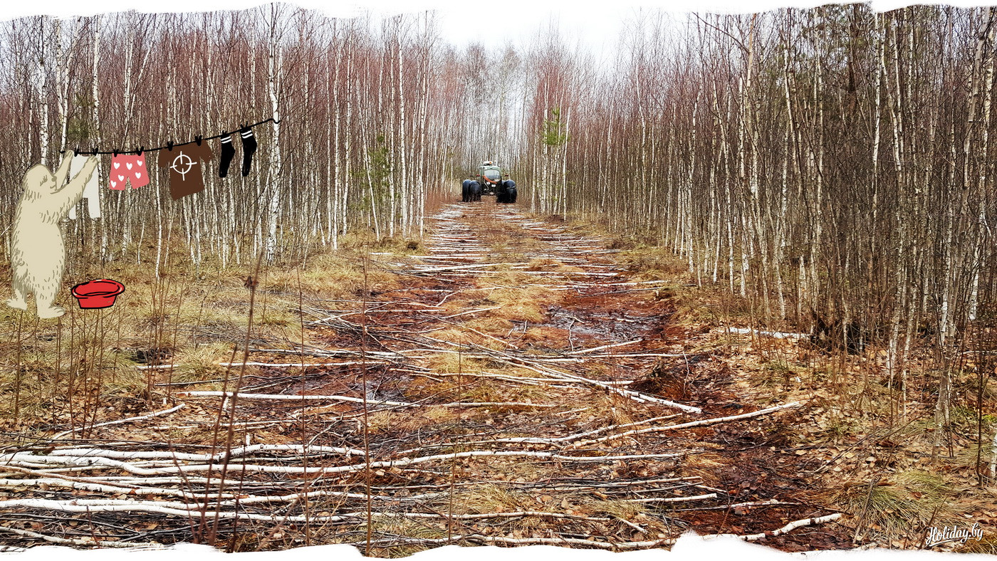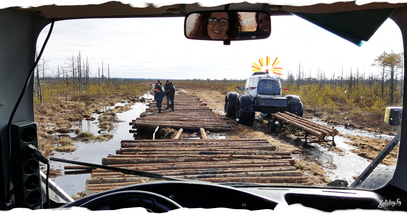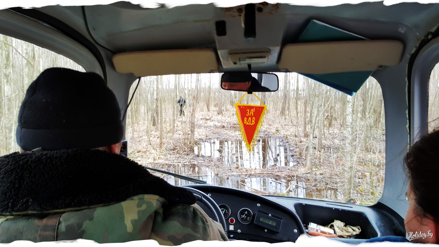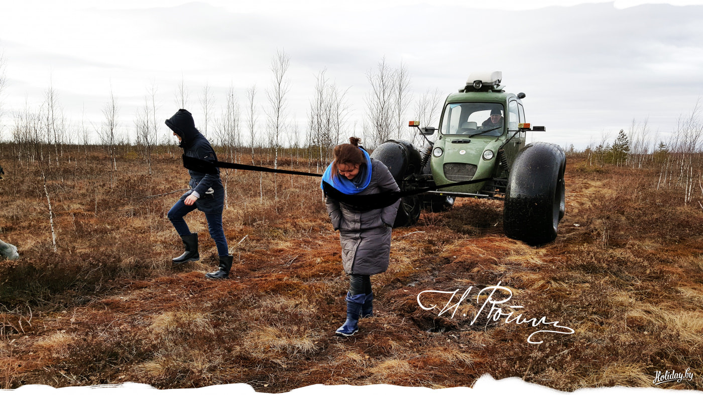 Ещё несколько попыток доползти до ближайшего лесочка – тебе туда очень надо. Почему? Нет времени объяснять! Вжжжжж….. всё! Ты плотно засел в этом весеннем капкане, но проехал туда, куда горожане сегодня даже и не думали ехать. Да и не смогли бы. В лучших традициях «эскейпа» меняешь коней. Запрыгиваешь в вовремя подоспевший болотоход и едешь дальше – строго по меридиану на север от Минска. Вокруг совершенно фантастические пейзажи, едешь, а затем идёшь пешком по воде, кочкам, брёвнам и болотным купинам».